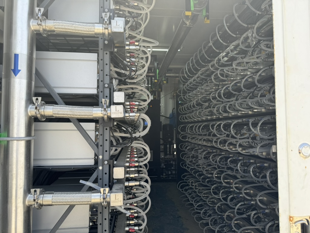 Liquid-cooled Bitcoin mining container and its interior: